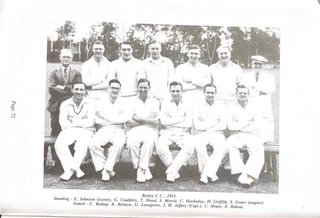 Other prominent members at this time included: George Couldrey, a useful batsman and hard working committee member: Bill Siveyer, who captained the 2nd XI for many years, always playing the game very seriously but being a model of friendliness and hospitality to the opposition afterwards: Stan Morris, who took wickets regularly until donning an umpire's coat in the mid-fifties: and Johnny Gaunt, who on his 73rd birthday carried his cricket bag to North Cray to play, took 6 wickets for 17 runs for the 3rd XI and walked back to Bexley after the match.