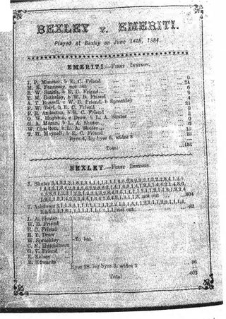 Readers may wonder why Bexley batted on for this huge score rather than declare and give Emeriti another innings. The reason is that until 1889 there were no declarations, and before that date teams often batted on long after it might have seemed more sensible to stop. Bexley were to be made to suffer from this tradition in two matches the following year, 1885.