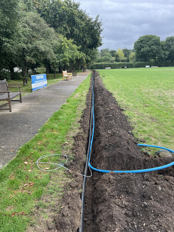 Due to the nature of the ground works we only had a small window of opportunity to complete the works, namely from mid-September into October. The borehole was dug and the tank installed whilst a ring main was dug around the perimeter of the ground. The installer then dug a number of channels into the outfield in order to put the sprinklers in place. Whilst digging these channels we did dig up huge lumps of concrete, particularly at the fishing lake end of the ground. We guessed these were part of a consignment of ‘topsoil’ used to level the ground many years ago. Once the underground pipework was completed, Dave Sealey then did a grand job in seeding over the bare patches to bring the ground back to scratch. The system was switched on and tested in early November and then drained down for the winter ready to be programmed in the spring.